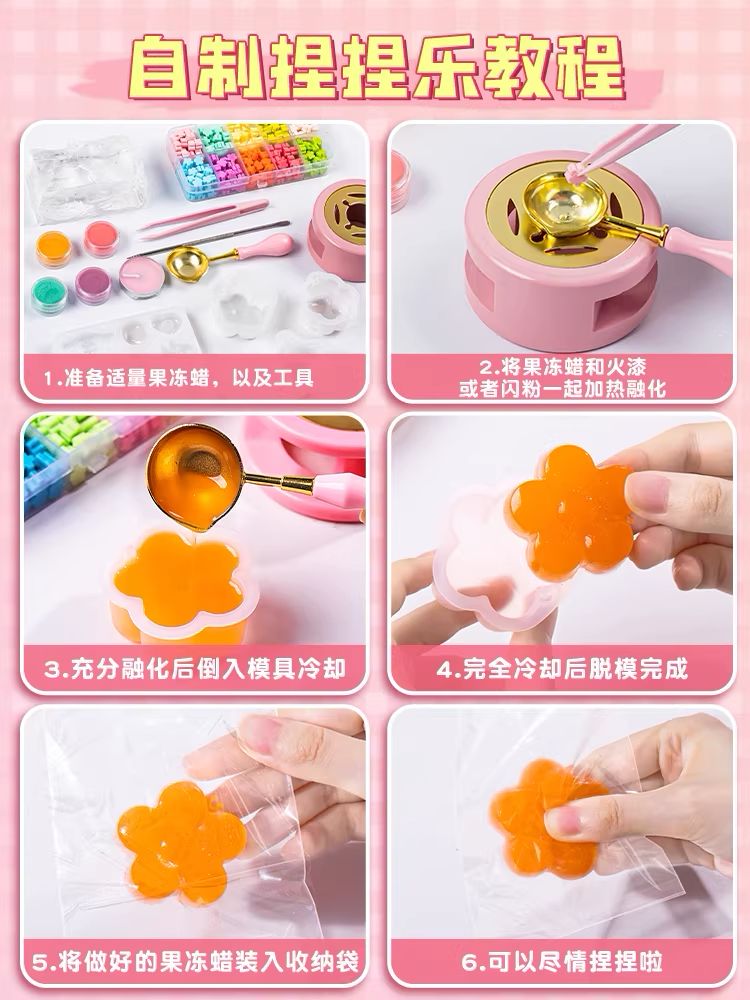 DIY jelly wax adalah mainan lilin yg bisa dicetak untuk dibuat squishy (mainan) dan stempel. Mainan ini memerlukan pendampingan orangtua karena faktor keamanan (sebab menggunakan api) ketika memainkannya.