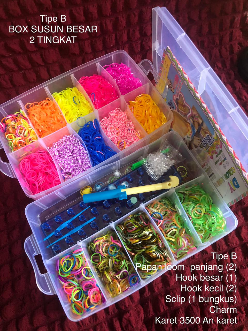 Mainan merajut rubber bands ini pertama kali buming di Amerika. Beda lho dg yg isi manik2 gitu. Kalo yg manik2 gitu utk anak PAUD. Kalo ini, ada hooknya buat merajut jg papan yg bisa dipake 'merajut'.