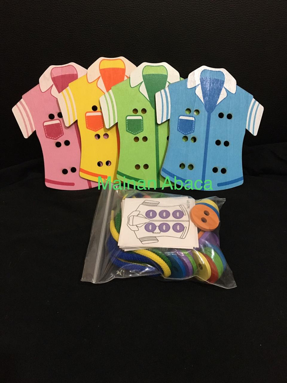 Mainan menjahit baju kayu dg 30 tantangan ini, selain merangsang anak utk berlatih fokus (konsentrasi) juga melatih ketelitian, kognitif dan motorik anak.